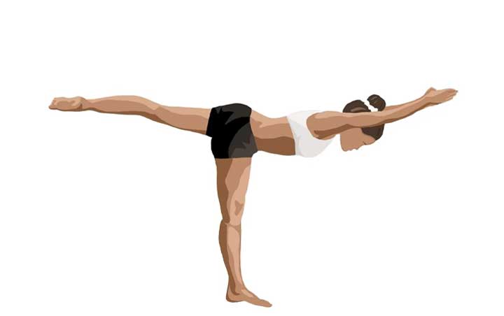 Tip: The hips need to be even and in one line in this posture to maintain balance and stability. At first, if this is not possible, bring the hands to the hips. This reduces the load on the back and hips, and will help you develop the necessary strength to do this posture.