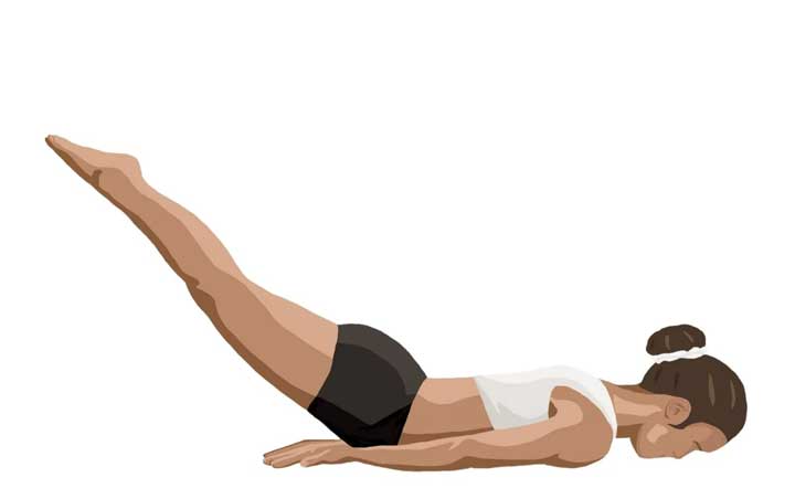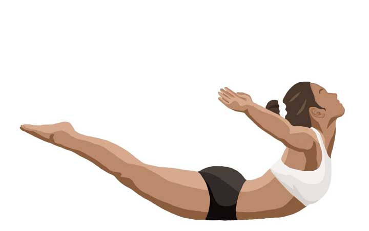 Poorna-Salabhasana strengthens the muscles that support the middle spine, opens the ribcage and firms the abdomen, thighs and arms. Compression of the kidneys and adrenal glans can potentially help reduce stress.