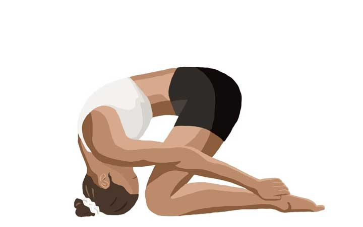 Ardha-Kurmasana gently stretches the spine and back muscles. Helps lower the heart rate, calm the mind and nervous system by focusing pressure on the forehead. Front side compression increases blood circulation to internal organs, lungs, heart and coronary arteries. Can potentially relieve neck and shoulder pain and stretch ankles, knees and hips.